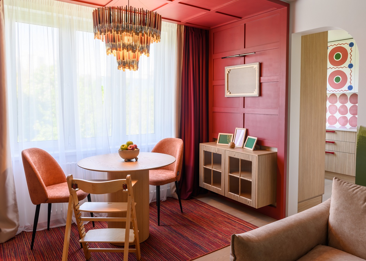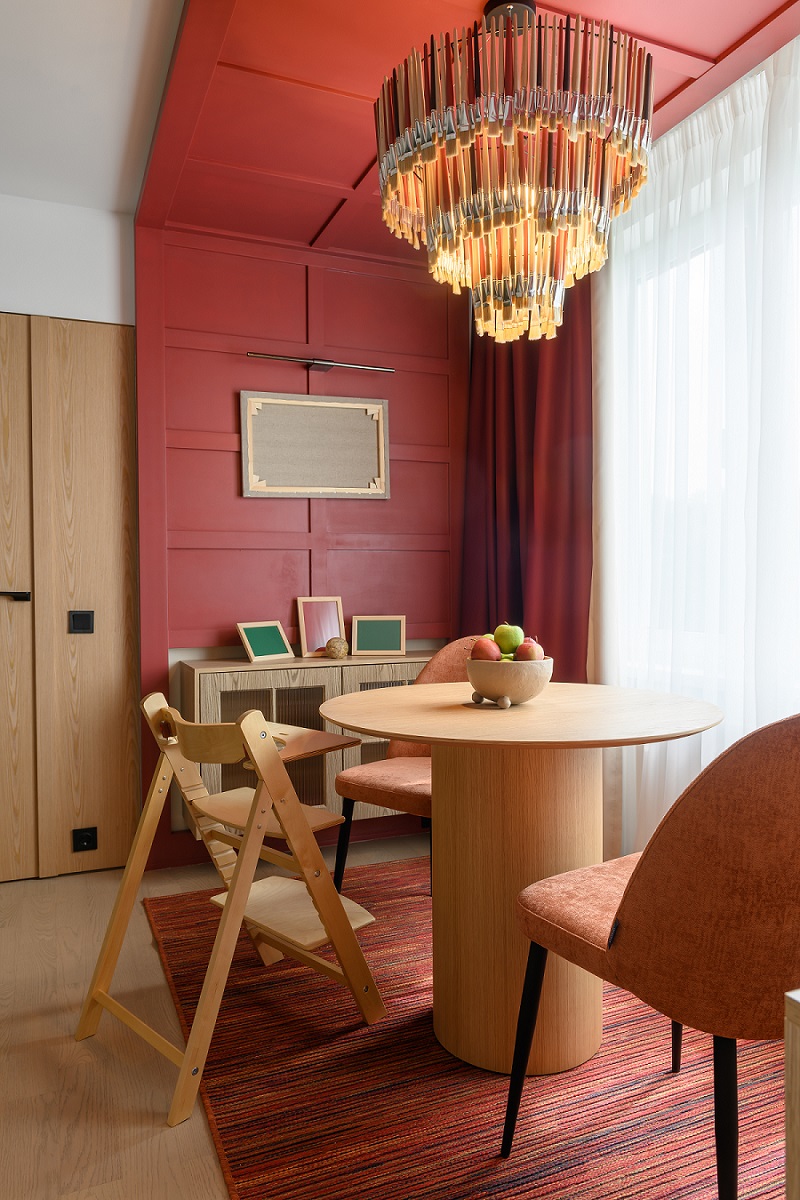 Люстра в абажуре из кистей для рисования в обеденной зоне — одна из фишек проекта.