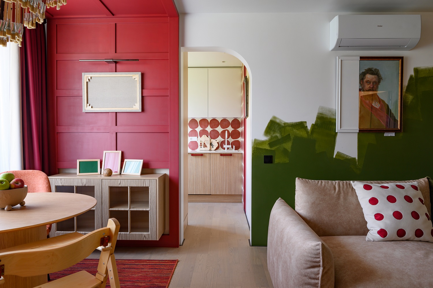 Весь интерьер получился очень гармоничным, и по цветовой гамме, и по расстановке мебели. Не обошлось и без лёгкого хулиганства дизайнера в виде частично закрашенных картин.